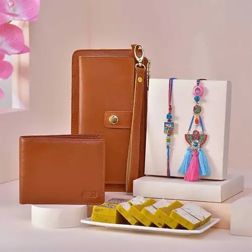 Celebrate Raksha Bandhan with a gift that blends tradition with elegance. This thoughtfully curated hamper includes a beautifully crafted Bhaiya Bhabhi Rakhi Set, symbolizing love, protection, and festive bonding. Indulge your loved ones with Chhappan Bhogs luxurious Kaju Kesar Burfi (200g)—rich, fragrant, and made with premium ingredients. Elevating the gesture further are two timeless accessories: a Premium Leather Wallet for Bhaiya and a sleek Leather Clutch Bag for Bhabhi. This gift set is more than a token—it’s an experience of taste, style, and celebration.