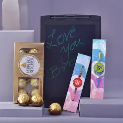 Delight your little sibling with this charming Raksha Bandhan gift box that features two kids Rakhi sets themed around Doraemon and Shinchan for a fun and loving celebration. Included are a soft toy and a pop-it keychain to keep the joy going beyond the festival. The stationery set comprises a pencil box, fancy highlighter pens, a pencil set, and a sharpener to support creativity and learning. Sweeten the day with two pieces each of Nestle Munch, Cadbury Perk, and Nestle Milky Bar chocolates, sure to bring smiles. A Roli Tikka small thali adds a traditional touch to the festivities. Packaged neatly in a reusable signature box, this gift also contains a complimentary message card with the Rakhi to convey your heartfelt wishes. (Design Code: KRMOB5700, KRDOR5697)