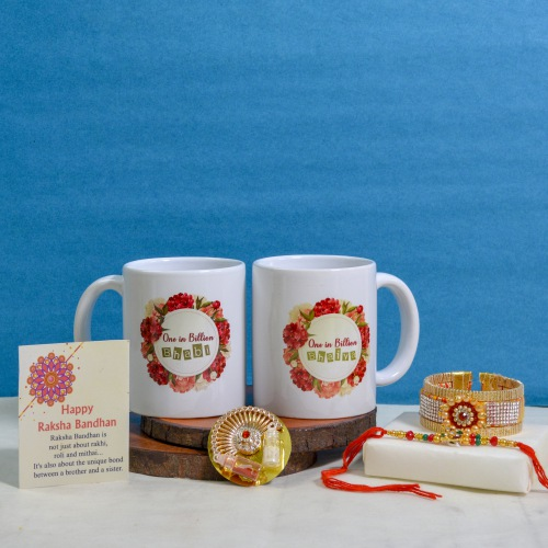Celebrate the joyous occasion of Raksha Bandhan with this specially designed gift hamper that includes a Bhaiya Bhabhi Rakhi Set to honor the sibling bond with elegance. Included is a personalized mug, customized with their names and a meaningful quote, adding a unique and thoughtful element to your gift. The hamper also contains a traditional Roli Chawal Thali, essential for the puja rituals, making it a complete and convenient gift package. To top it off, a free message card is provided for you to pen down your warm wishes. Featuring design codes ADKU2587 and PLUMK9297, this hamper combines heartfelt personalization with cultural tradition, making it a cherished gift for your beloved Bhaiya and Bhabhi.