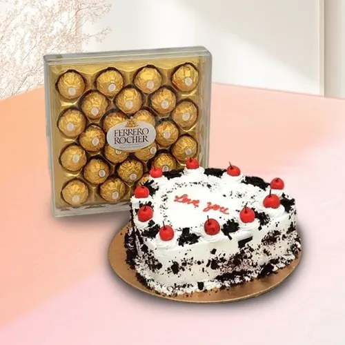 Send lovely wishes as you send online this Delightful Love You Heart Shape Black Forest Cake (1kg) N 24pc Ferrero Rocher Chocolate Pack Treat and spread love among the people you care for.
