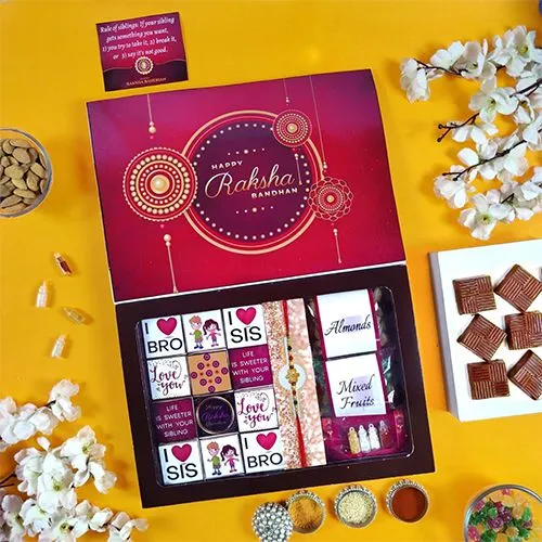 Surprise your brother with our Traditional Rakhi and Chocolate Extravaganza gift box this Raksha Bandhan. Featuring a beautifully crafted Rakhi, this box is packed with 12 pieces of chocolates in enticing flavors such as Roasted DryFruit, Cranberry, Paan, Butterscotch, Mix Fruits, and Chocochip. The set also includes 60g of premium almonds and 60g of mixed fruits for a delicious balance. For the traditional rituals, weve included Tikka, Chandan, Chawal, and Mishri. A special Rakhi-themed greeting card lets you express your love and appreciation. This gift box is a perfect blend of sweetness, tradition, and heartfelt emotions, making it an ideal way to celebrate the bond between you and your brother.