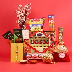 Make this Rakhi celebration unforgettable with a basket full of sweet delights! Featuring chocolate brownies, a delightful cookie tin, and nutty treats, this hamper is designed to bring smiles and joy to your loved ones.
